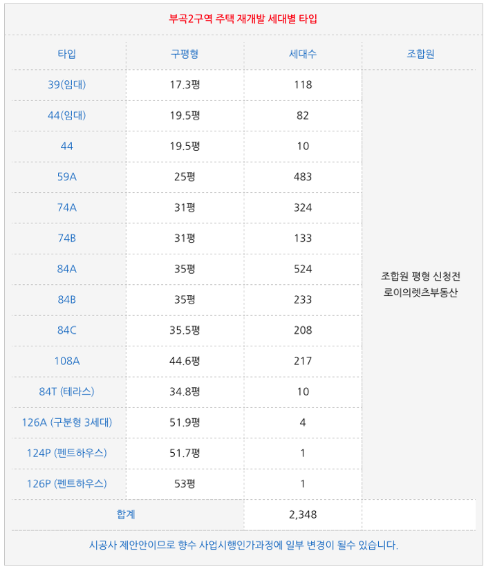 부곡2구역 재개발의 각 타입별 세대수입니다.