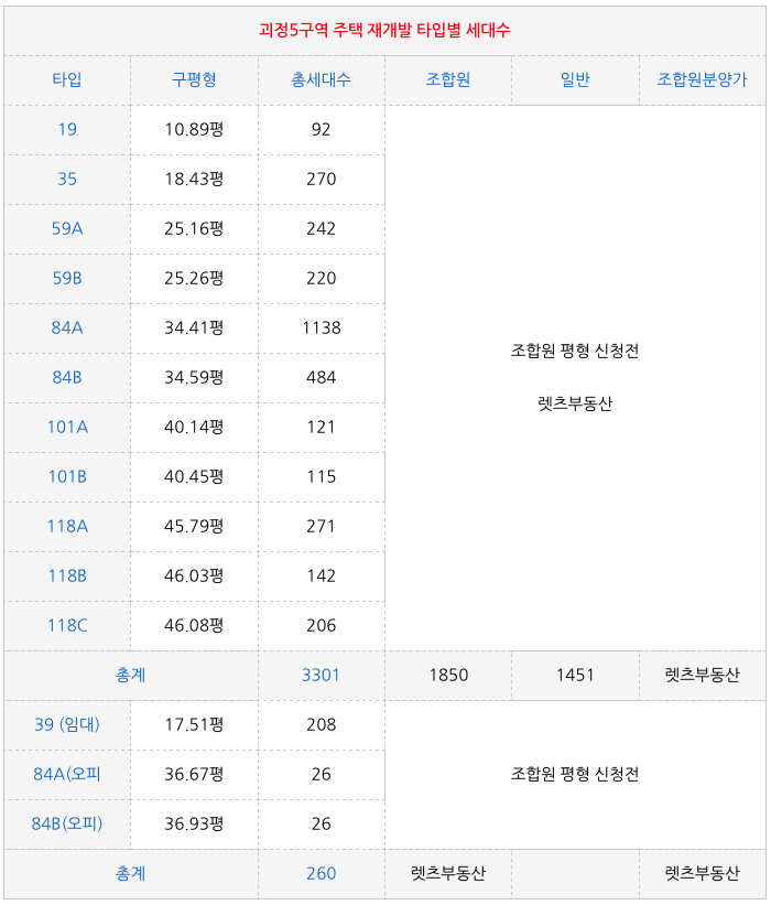 괴정5구역 재개발의 타입별 세대수 입니다.