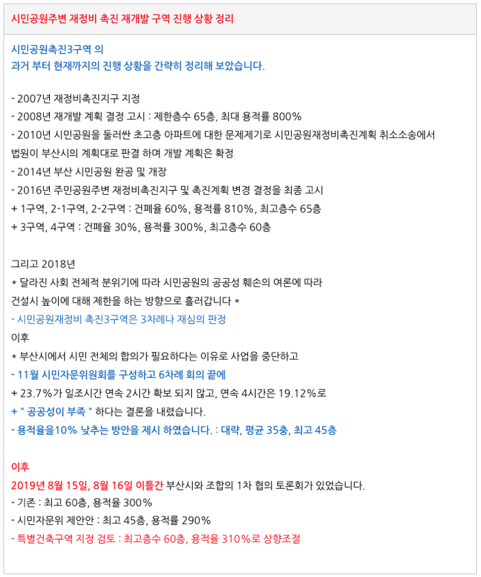 시민공원 주변 재정비 촉진 재개발 구역의 그간 진행 전부 상황을 간략히 정리해 드립니다.