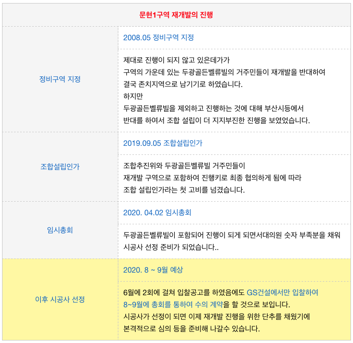 작년에 조합설립이 완료되었고 이제 시공사 선정을 앞두고 있으며 아마 8~9월 중에 총회를 하지 않을까 합니다.