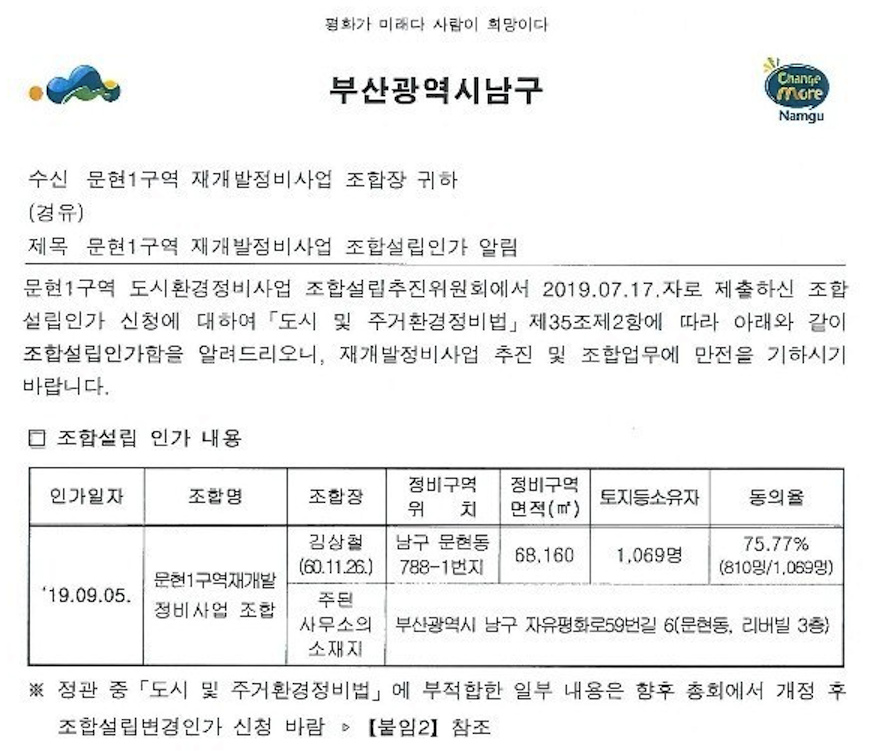 - 기존 존치 지역이었던 두광골든벨류빌을 포함하기로 하였고 부산 남구청으로 부터 조합 설립 인가를 받았습니다.