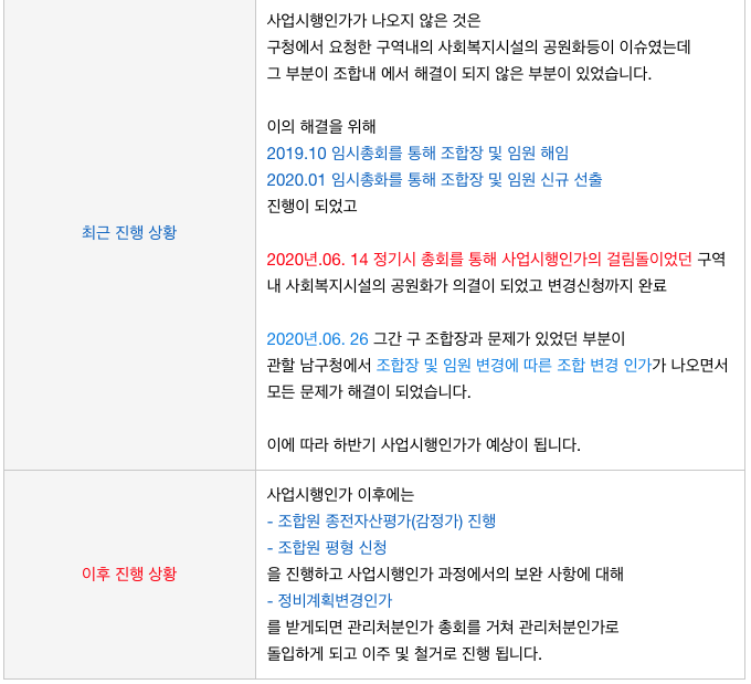 하지만, 현재는 조합 내부도 새롭게 정비가 되었고 총회를 통해 사업시행인가를 위한 보완 부분도 해결되었습니다.