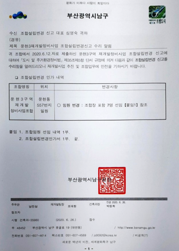 6월 조합원 임시총회를 통해 문제가 해결이 되었고 조합장 변경등의 변경 조합 변경인가도 마무리가 되어