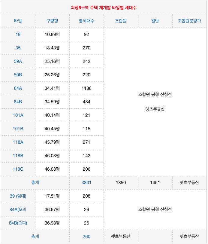 괴정5구역 재개발의 타입별 세대수의 특징으로