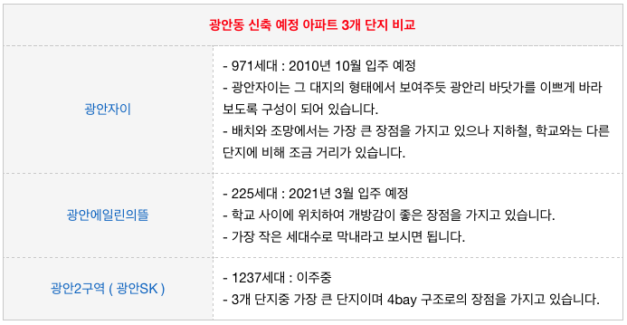 현재 광안2구역은 이주가 거의 마무리 단계이며 철거가 되면 내년에는 일반 분양 될 것으로 보입니다.
