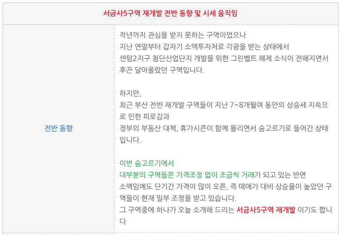 서금사5구역 재개발 시세의 움직임과 물건을 소개해 드리겠습니다.