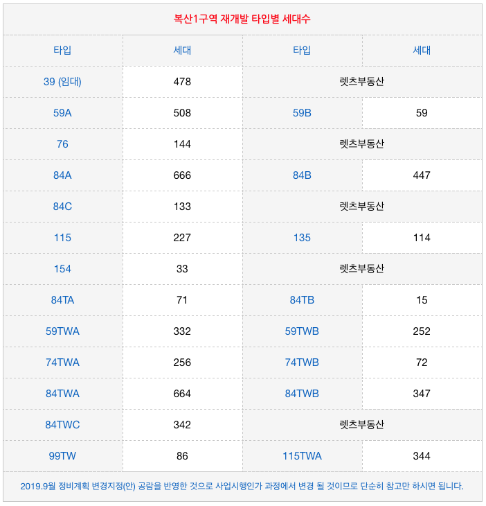 복산1구역 재개발의 각각 타입별 세대수입니다.