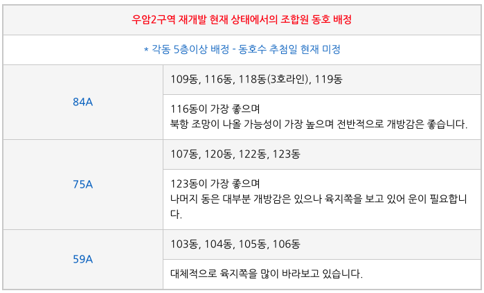 우암2구역 재개발의 기존 조합원 동호수 배정내용입니다.