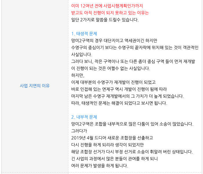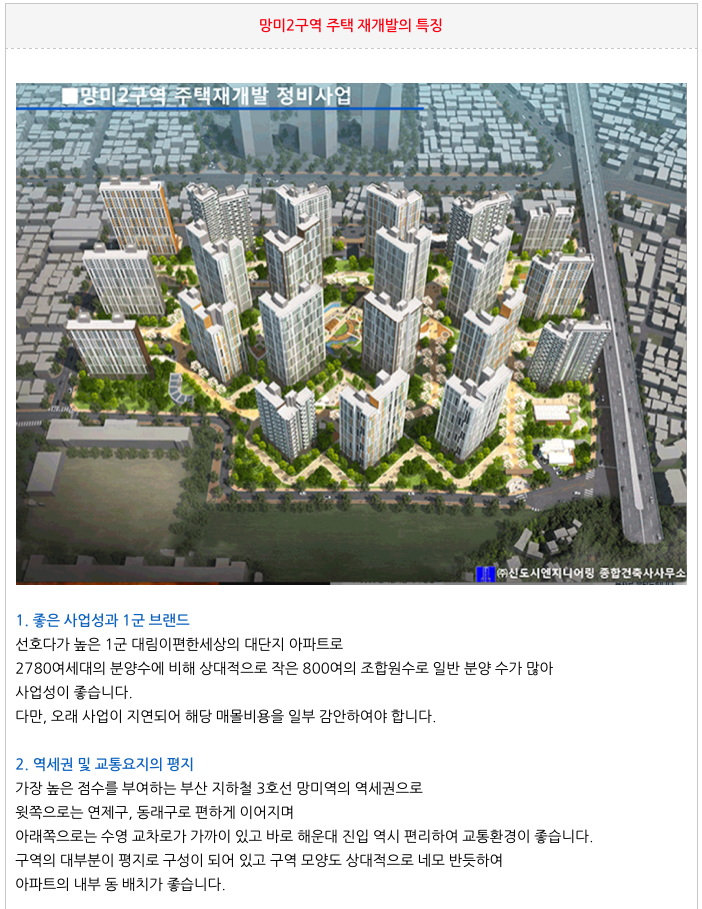 마지막으로 망미2구역 재개발의 간략한 특징을 정리해 드립니다.
