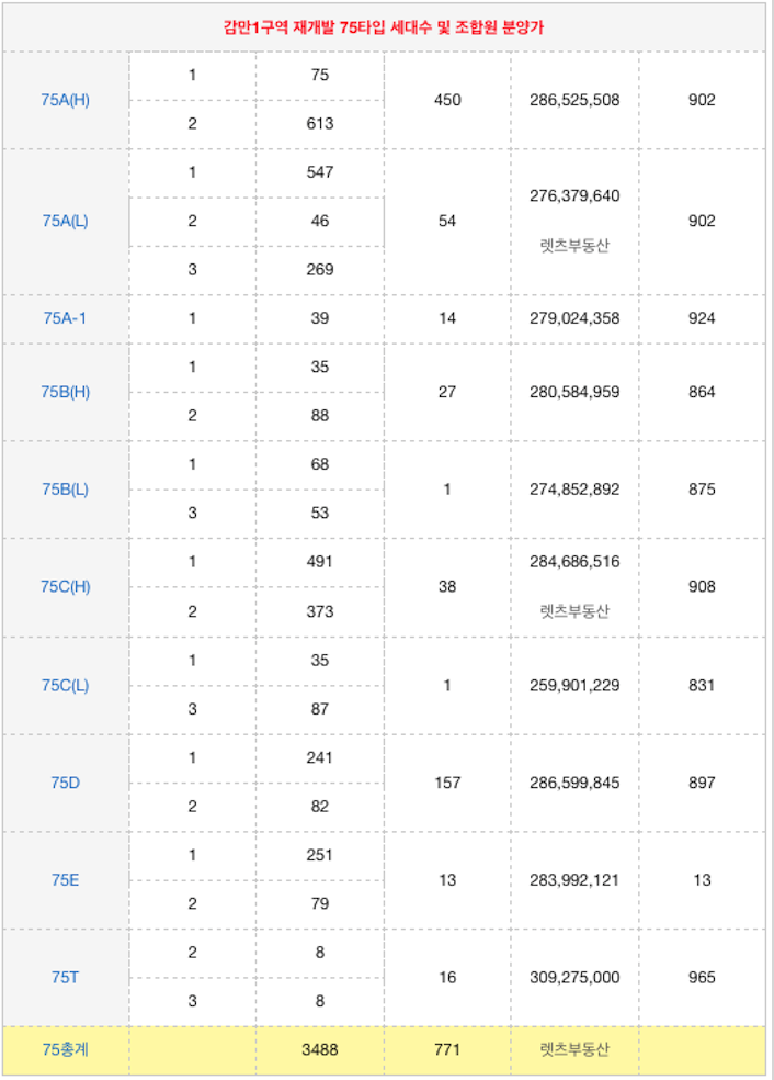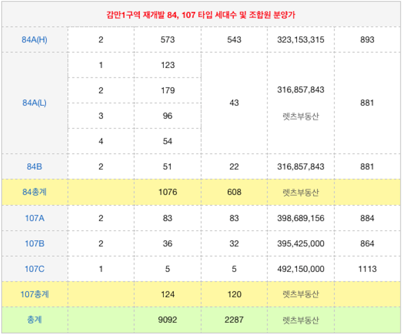 감만1구역 재개발의 관리처분계획인가 를 위한 총회시 에 발표된 각 타입별 세대수와 조합원 분양가 입니다.
