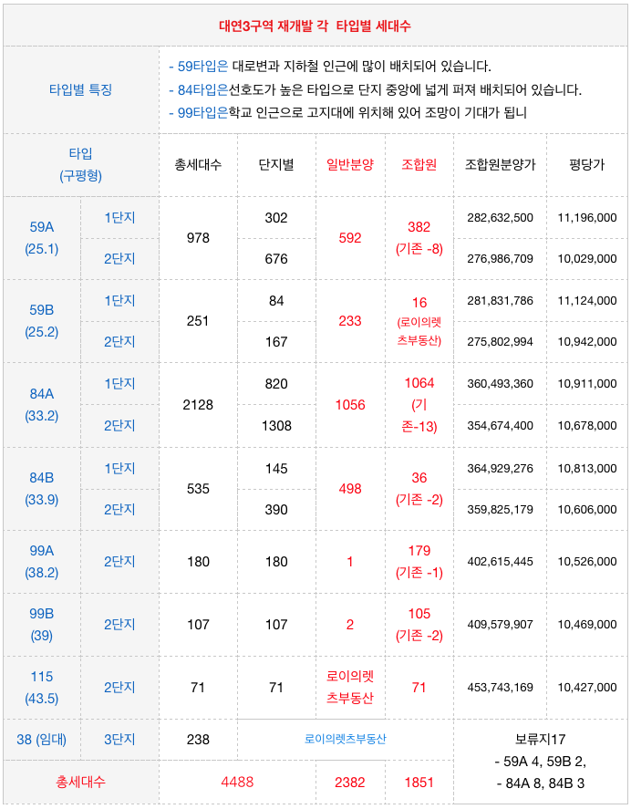 대연3구역 재개발의 각 타입별 세대수입니다.