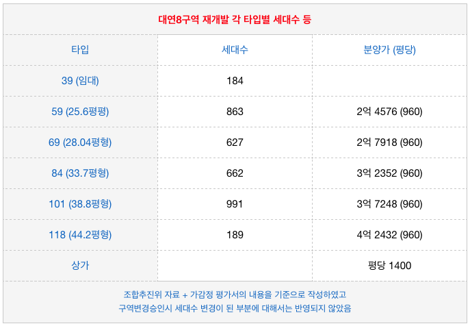 대연8구역 재개발의 타입별 세대수 및 조합원 분양가 입니다.