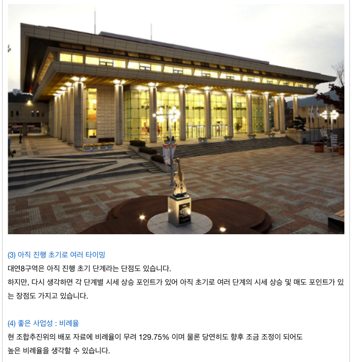 남구 전반이 시세가 많이 상승하였고 대연8구역 역시도 현재 시세가 꽤 상승해 있어서 단기 투자로는 수익률을 맞추기는 쉽지 않습니다. 하지만 아직 많은 단계가 있으므로 가격 상승 포인트 역시 다수 존재합니다. 1차 포인트 2~3여년 후로 예상되는 사업시행인가 이후 2차 포인트 4~5년 관리처분인가 이후 가 좋은 포인트로 보입니다. |