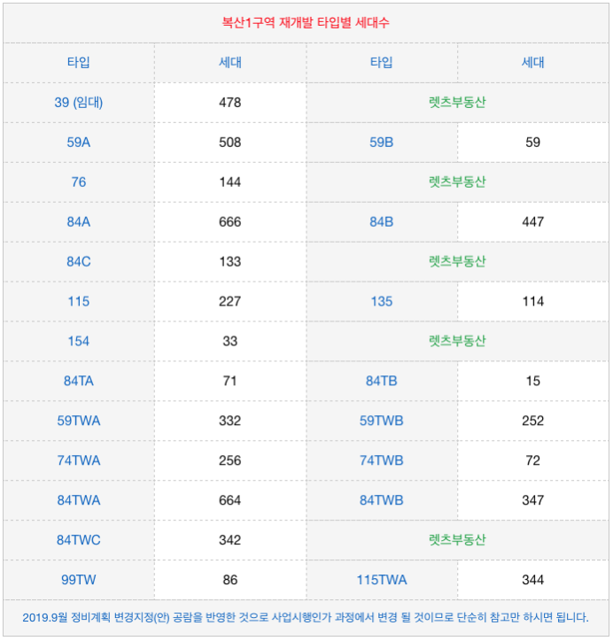복산1구역 재개발의 각타입별 세대수 입니다.
