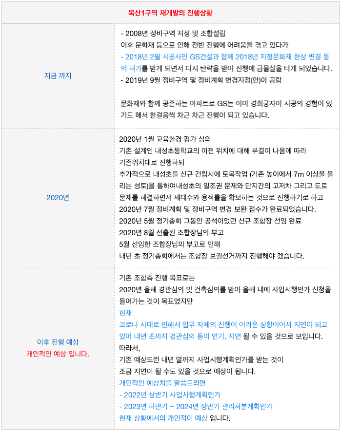 복산1구역 재개발의 현재 진행 상황 입니다.
