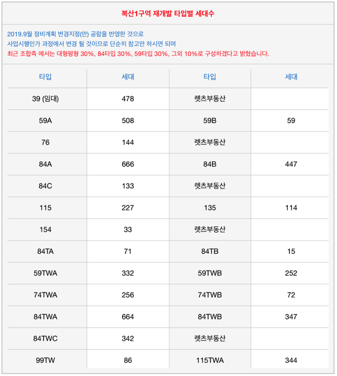 복산1구역 재개발의 전체 타입별 세대수 수치입니다.