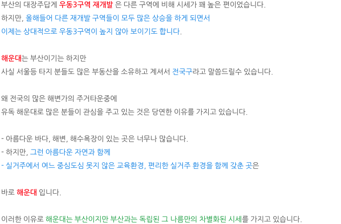 부산 재개발의 1등 대장주로 꼽히는 해운대 우동3구역 재개발 소식과 물건을 소개해 드립니다.