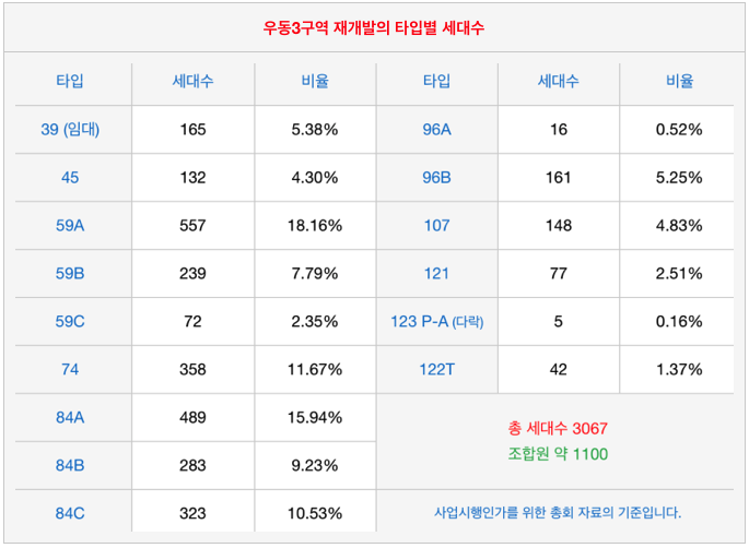 우동3구역 재개발의 각 타입별 세대수입니다.