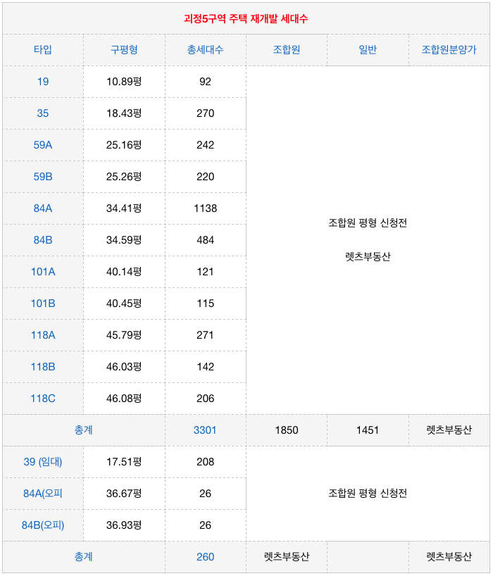 괴정5구역 재개발의 평형별 세대수 입니다.