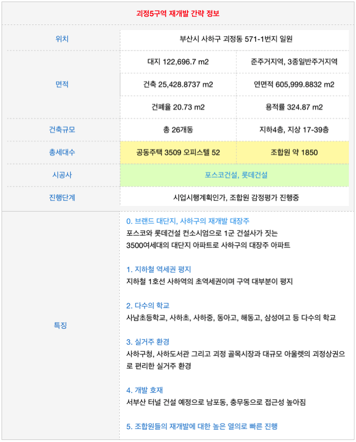 사하구 대장주 괴정5구역 재개발의 물건을 간략히 업데이트 해 드립니다.
