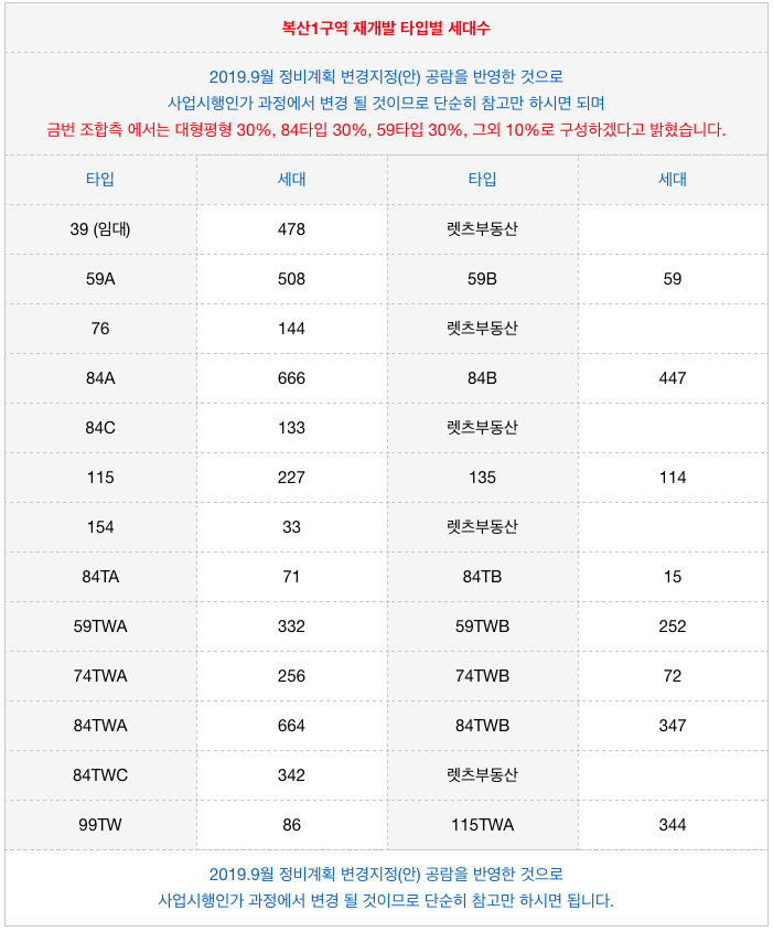 현재의 각 타입별 세대수로 아래 수치는 향후 사업 시행인가 과정에서 조금 변동이 생길수 있습니다.