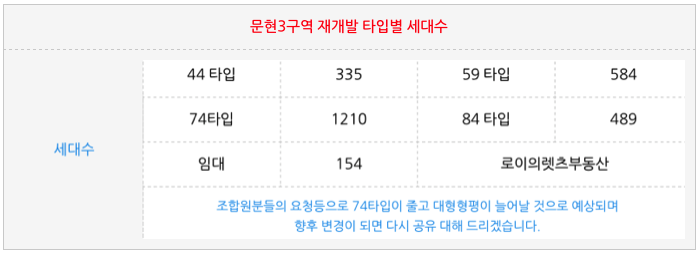 현재의 실정과 맞지 않고 조합원 분들의 요구에 따라 작은타입의 세대수가 좀 줄고 84이상의 타입의 세대수가 증가할 것이라 하오니