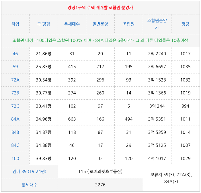 조합원 층 배정은 84A타입은 조합원이 많아 6층이상 배정 예정이고 나머지는 10층이상 배정이 됩니다.