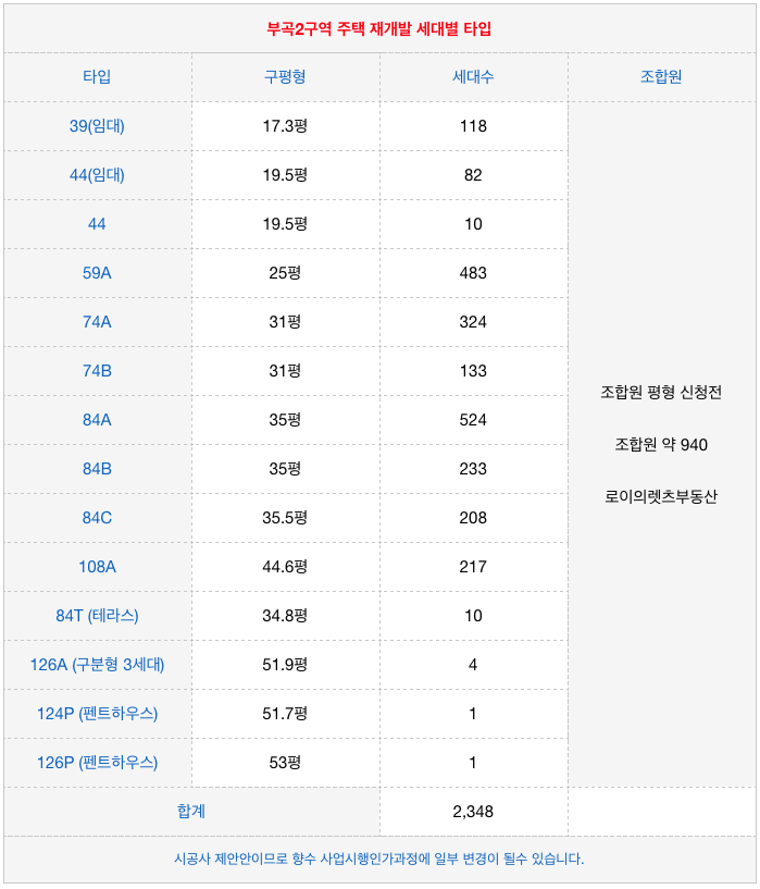 부곡2구역 재개발은 각 평형 타입별 세대수 입니다.