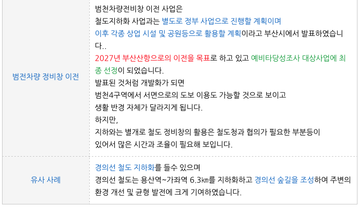 부산 경부선 철도 지하화와 범천 차량정비창 이전 관련 내용을 정리하였습니다.