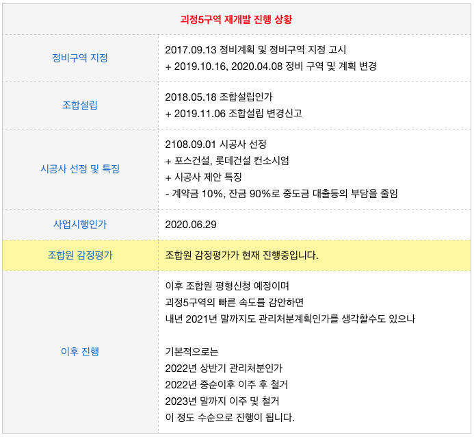 괴정5구역 재개발의 진행상황 입니다.