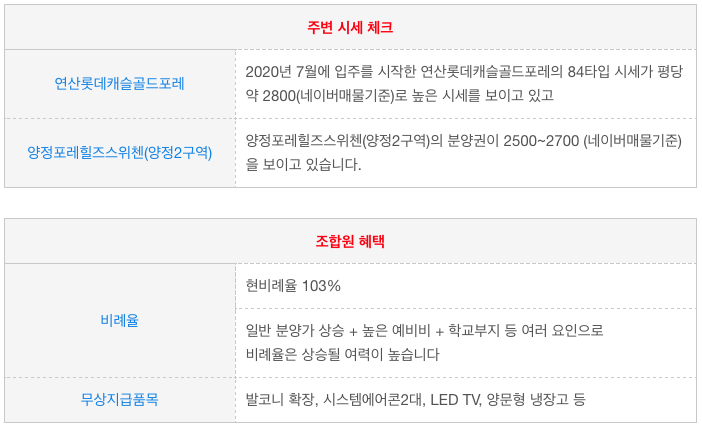 - 바로 인접하고 있는 양정2구역 양정포레힐즈스위첸과 연산롯데캐슬골드포레의 시세가 많이 상승하였고