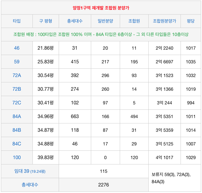 양정1구역 재개발의 각 타입별 세대수와 조합원 평균 분양가 입니다.