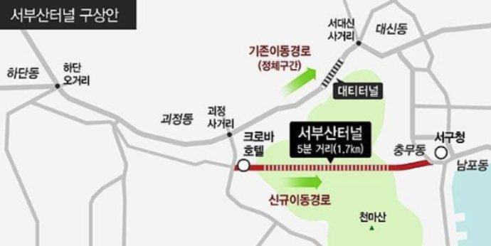 괴정4거리에서 충무동사거리로 연결이 되는 서부산터널 ( 대티2터널 )이 향후 건설이 되면