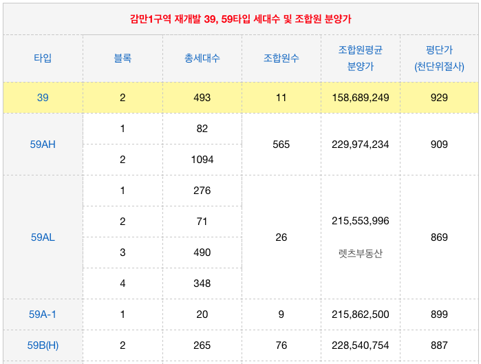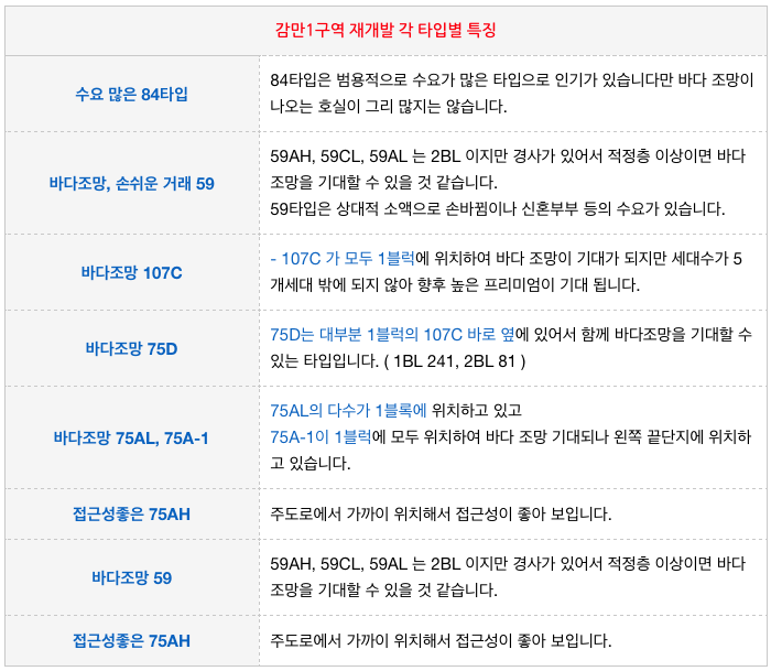 감만1구역 재개발 의 각 타입별 특징 및 타입별 세대수, 조합원 분양가 를 정리해 드립니다.