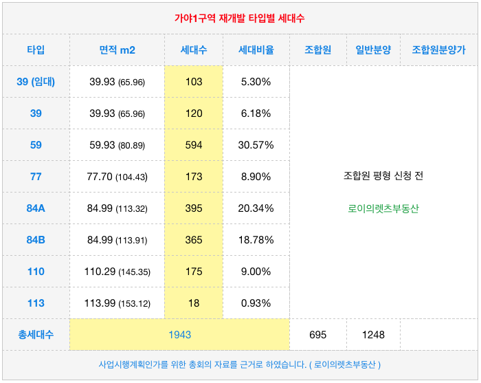 가야1구역 재개발 의 타입별 세대수 입니다.