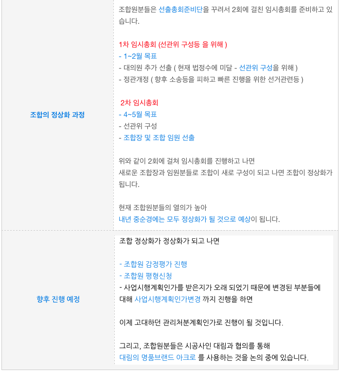 현재 조합원분들은 선출총회준비단을 꾸려서 2회에 걸친 임시총회를 통해 ( 아래 진행상황 참고 )