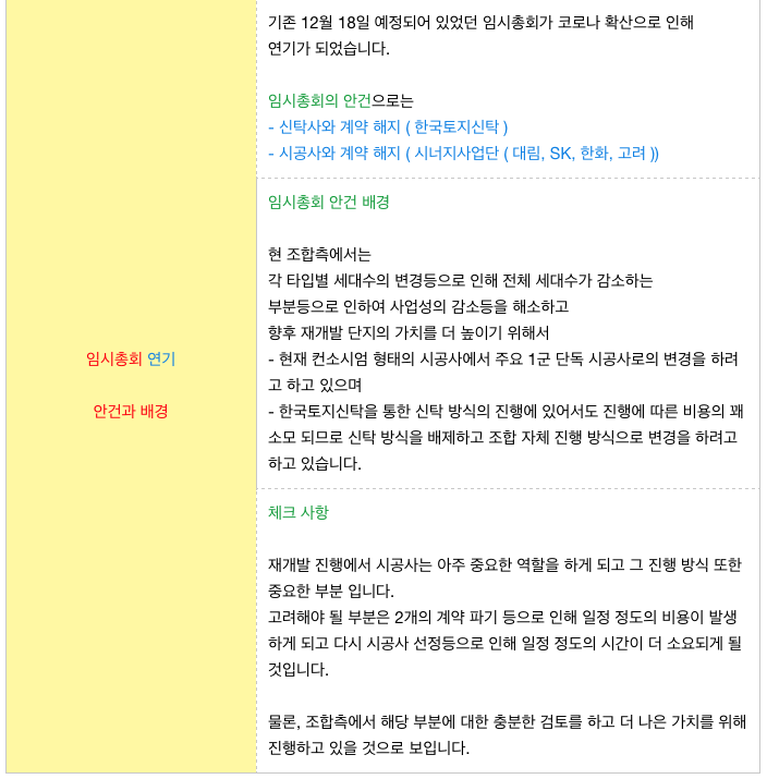 임시총회 일정이 다시 잡히면 알려드릴 예정이며 해당 안건들에 대해서는 아래 표를 참조 부탁그립니다