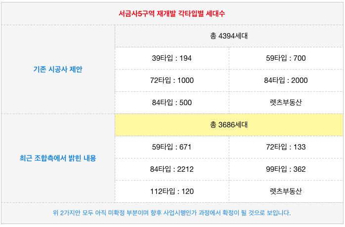 아래 평형 타이별 세대수는 기존 시공사 제안안과 84타입이상을 대폭 늘린 최근 조합측에서 밝인 제안안 으로