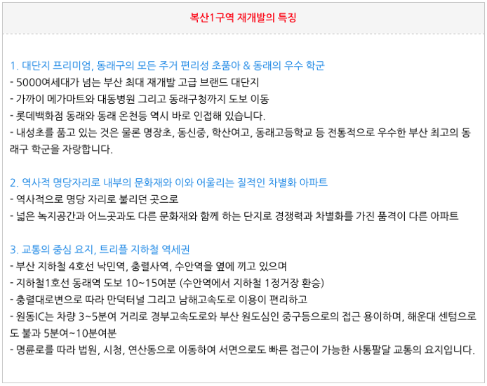이런 장점들을 가지고 있기에 동래구의 대장주 재개발로 꼽히고 있는 곳이기도 합니다.