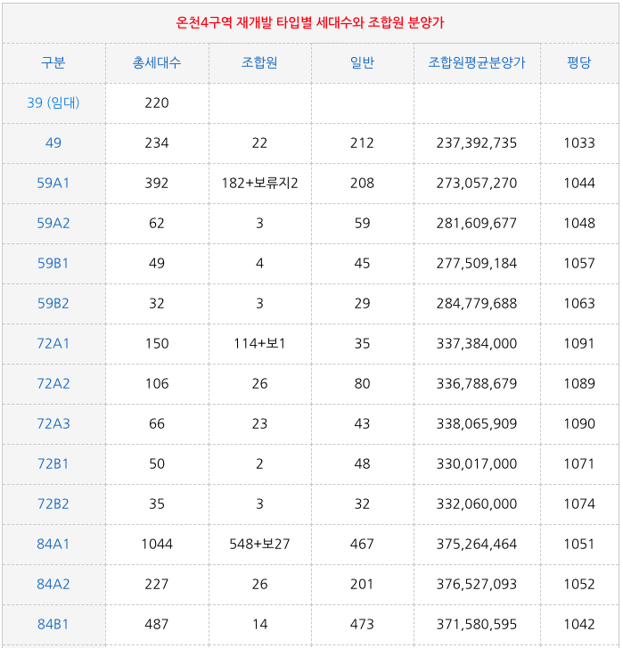 온천4구역 재개발은 각 타입별 세대수 및 조합원 평균 분양가 입니다.