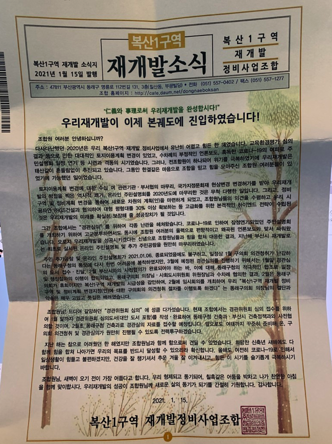 복산1구역 재개발의 2021년 1호 소식지가 1월에 배포 되어 소개해 드립니다.