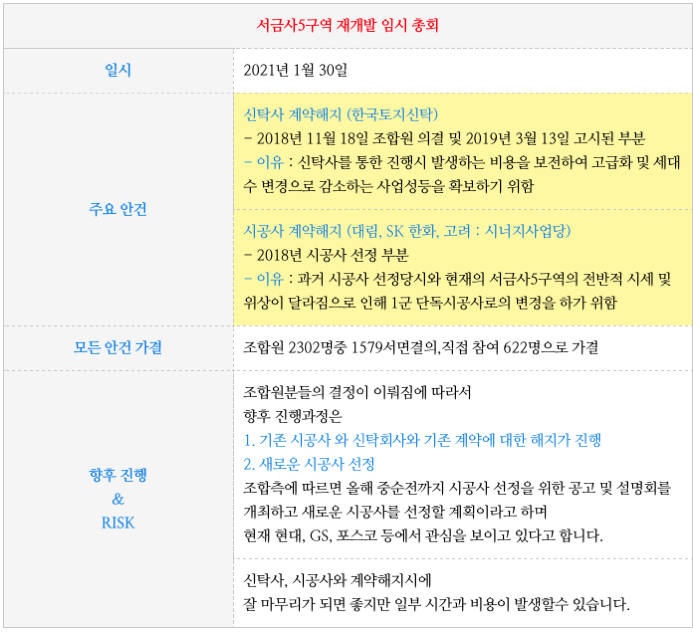 대단지 서금사5구역 재개발 조합원총회결과(시공사,신탁사해지) 및 현 매물