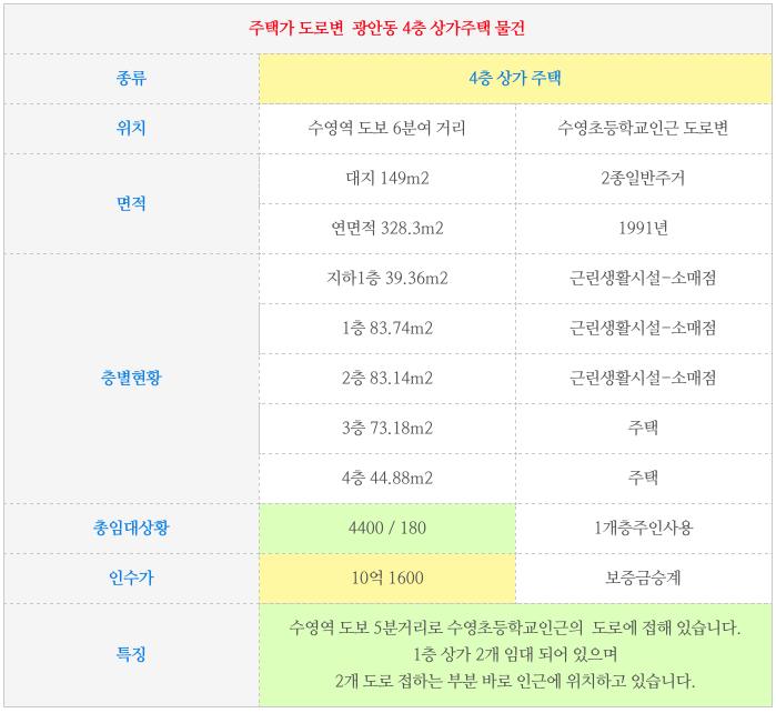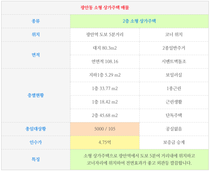1. 광안동 코너위치 소형 상가주택 : 4.75억 인수