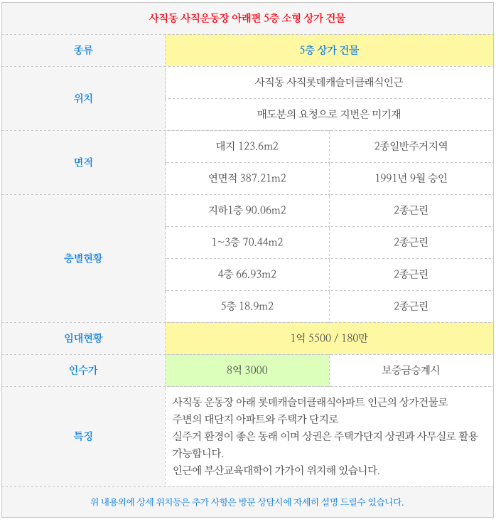 1. 실거주 좋고 시세 좋은 사직동 소형 5층 상가 건물 : 운동장 근처, 부산교대인근