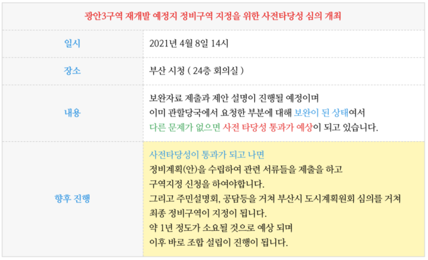 수영구 광안3구역 재개발 예정지 사전타당성 싱의 소식과 물건을 업데이트 해 드리겠습니다.