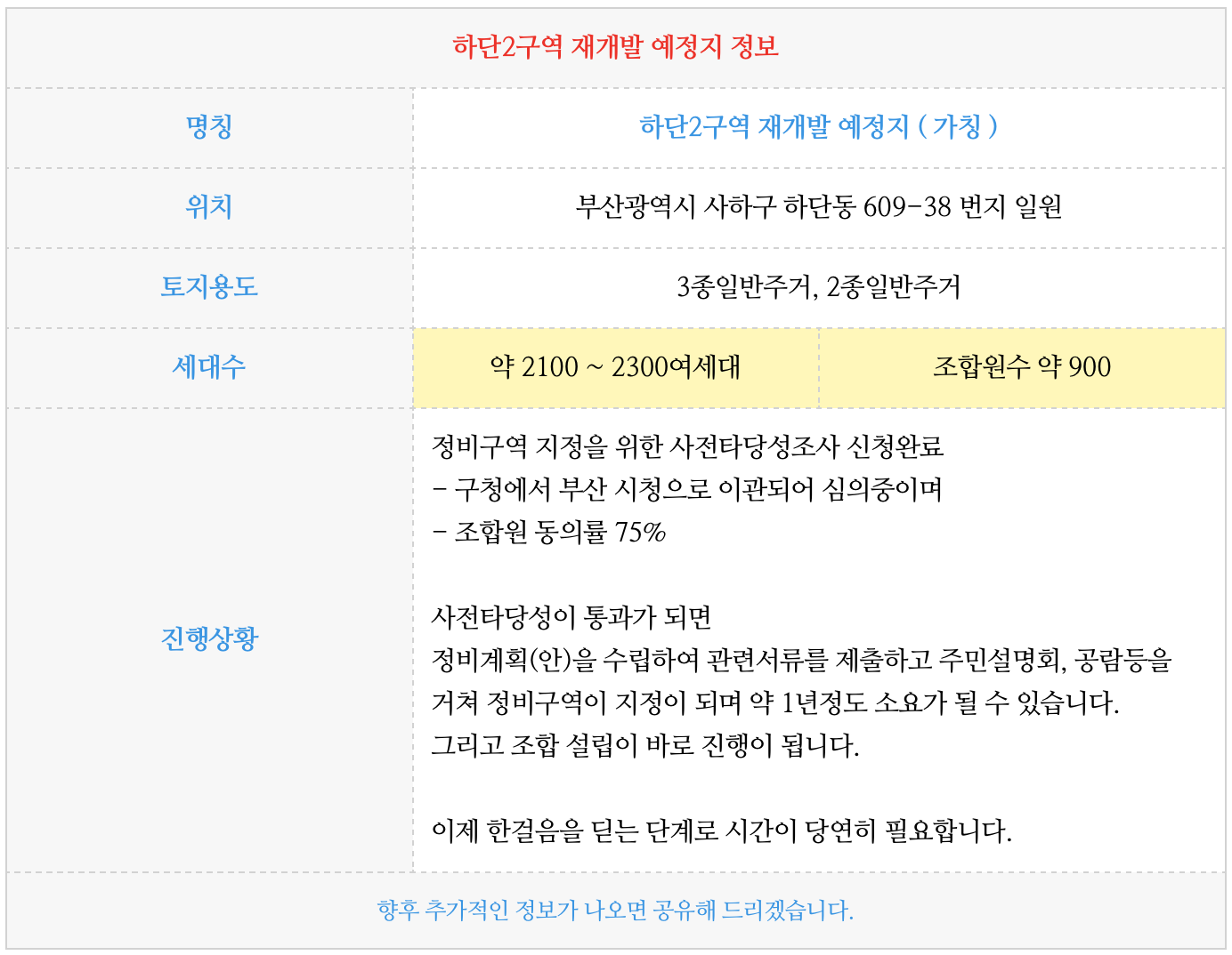 사하구 하단2구역 재개발 예정지에 대해 궁금 하신 점은 연락주시면 자세히 설명 드리겠습니다.