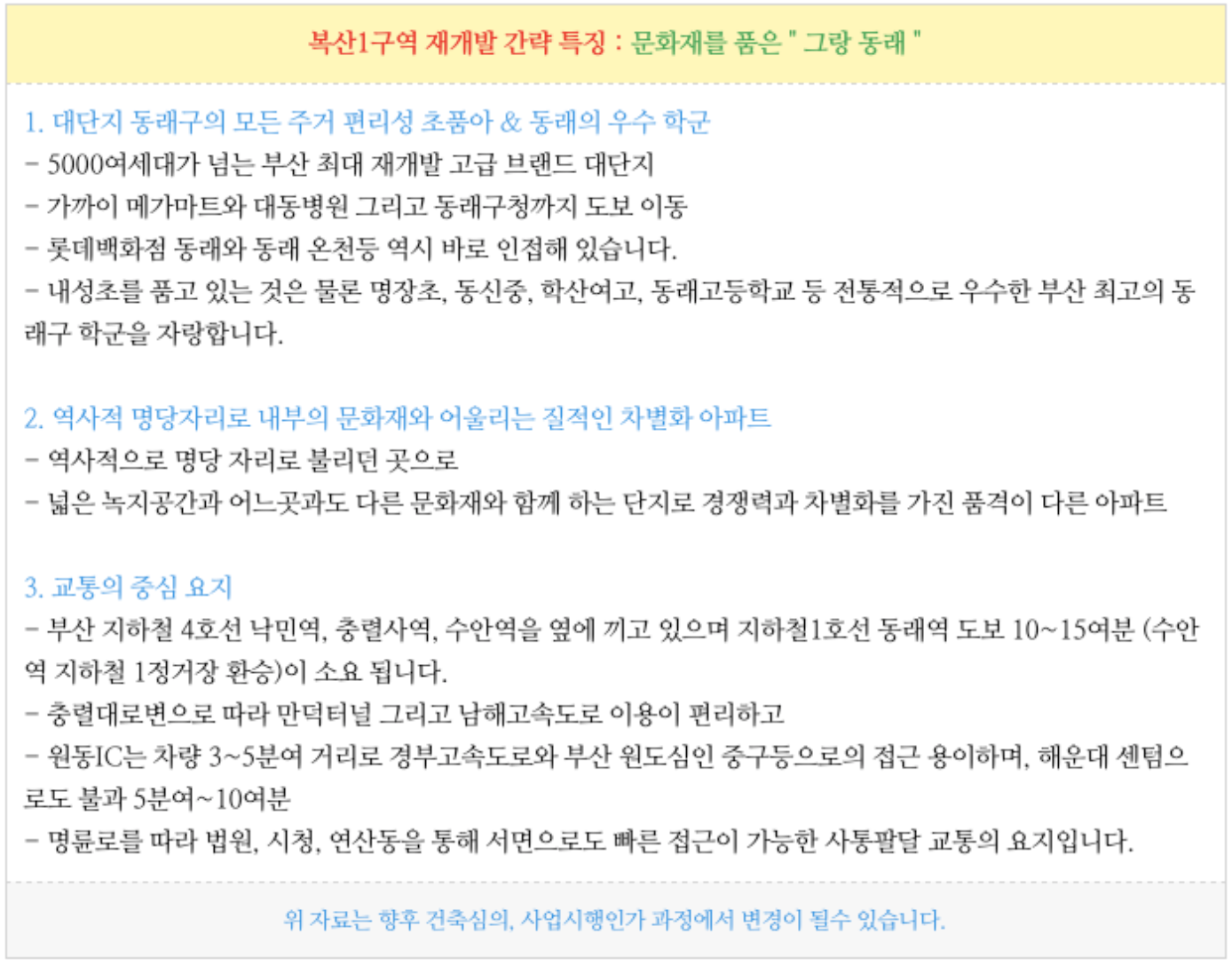 부산에서 실거주 환경 및 학군이 우수한 동래구의 중심에 위치해 있다는 것이 가장 큰 장점으로