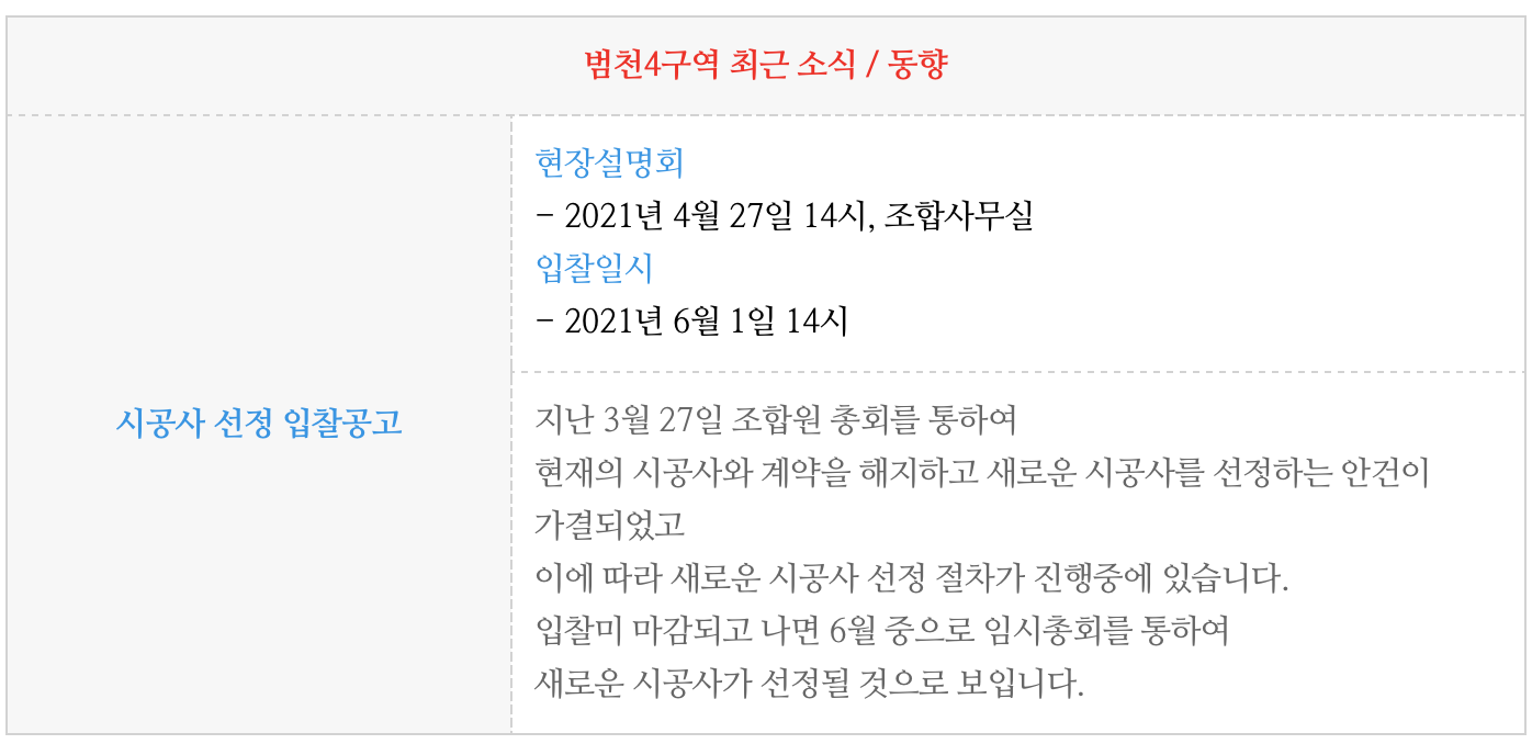 지난 3월말 총회를 통해 기존 시공사 계약 해지 안건이 통과 되어 새로운 시공사 선정 절차가 진행이 되고 있습니다.