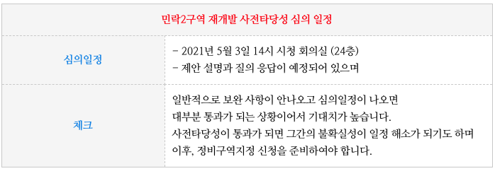 - 먼저 사전타당성이 신청된 다른 구역들에 비해 상당히 빠르게 심의일이 확정이 되었습니다.
