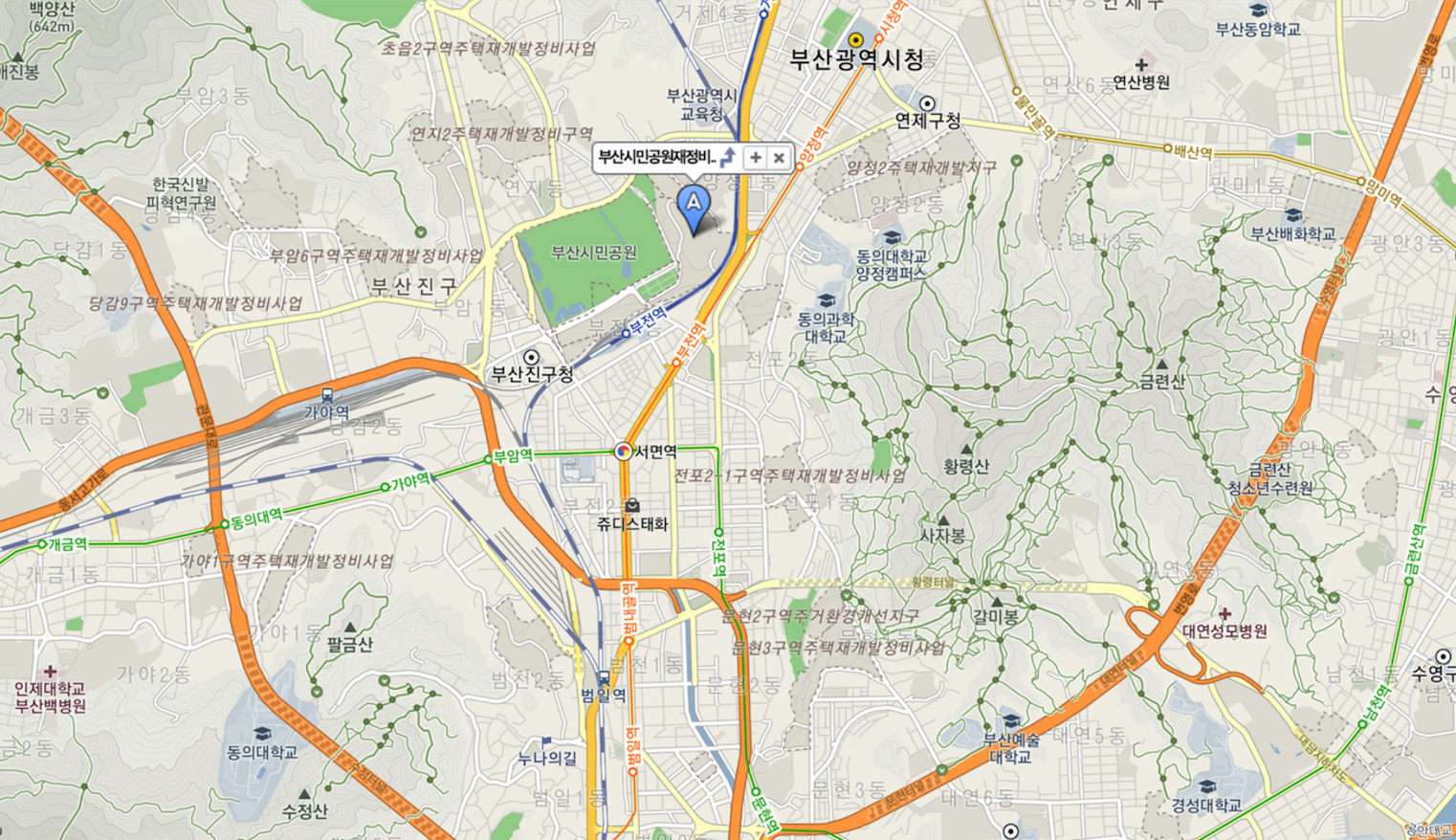 부산 시민공원의 동쪽에 위치하여 도심내 최대공원인 부산시민공원을 남서향으로 조망을 하게 됩니다.